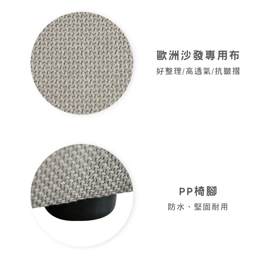 原物料:歐洲沙發專用布 / 12層內材 / PP椅腳