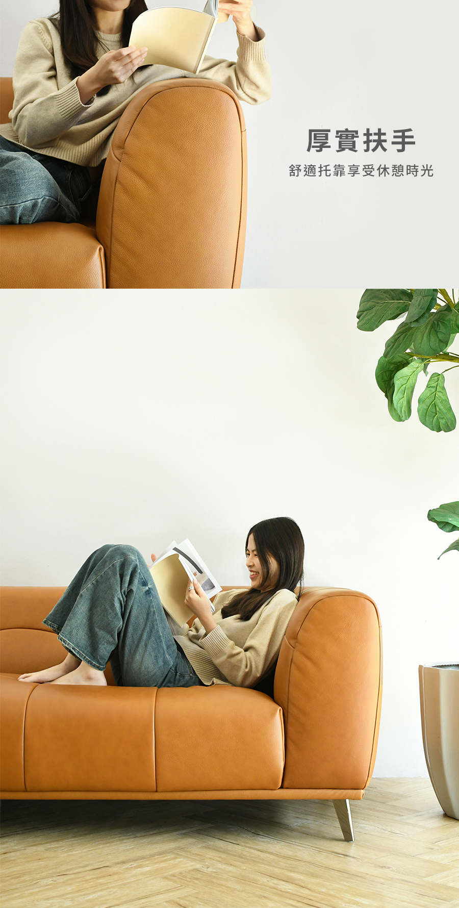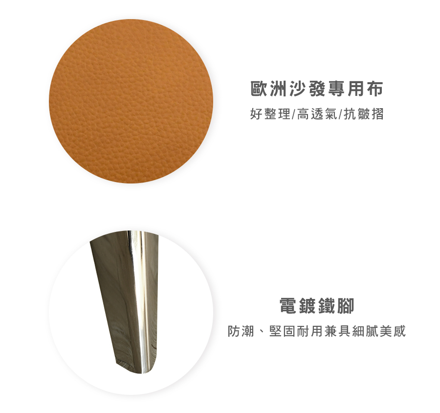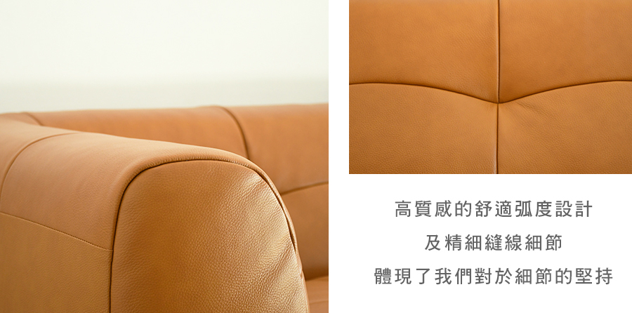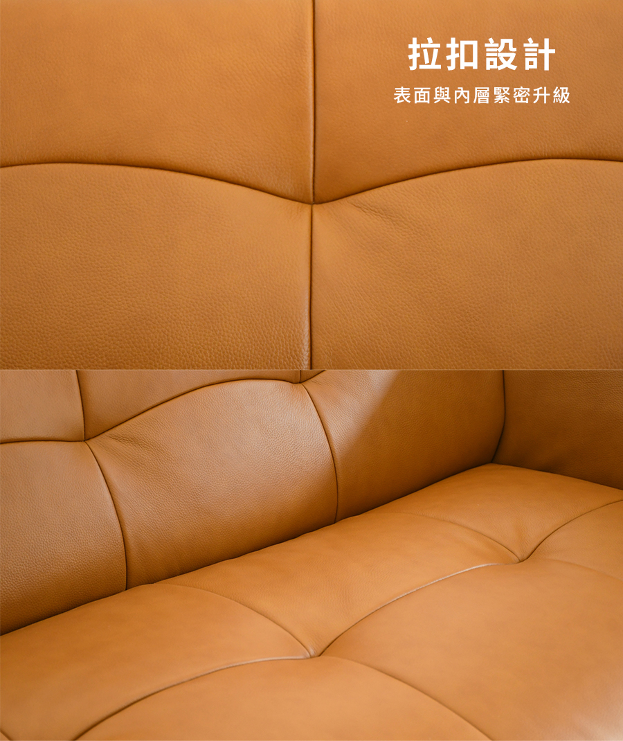 經常接觸的椅面部分,採用透氣、柔軟的荷蘭頭層牛皮,堅韌耐用,呈現自然變化;其餘部分為PVC,防止受潮及黴菌滋生