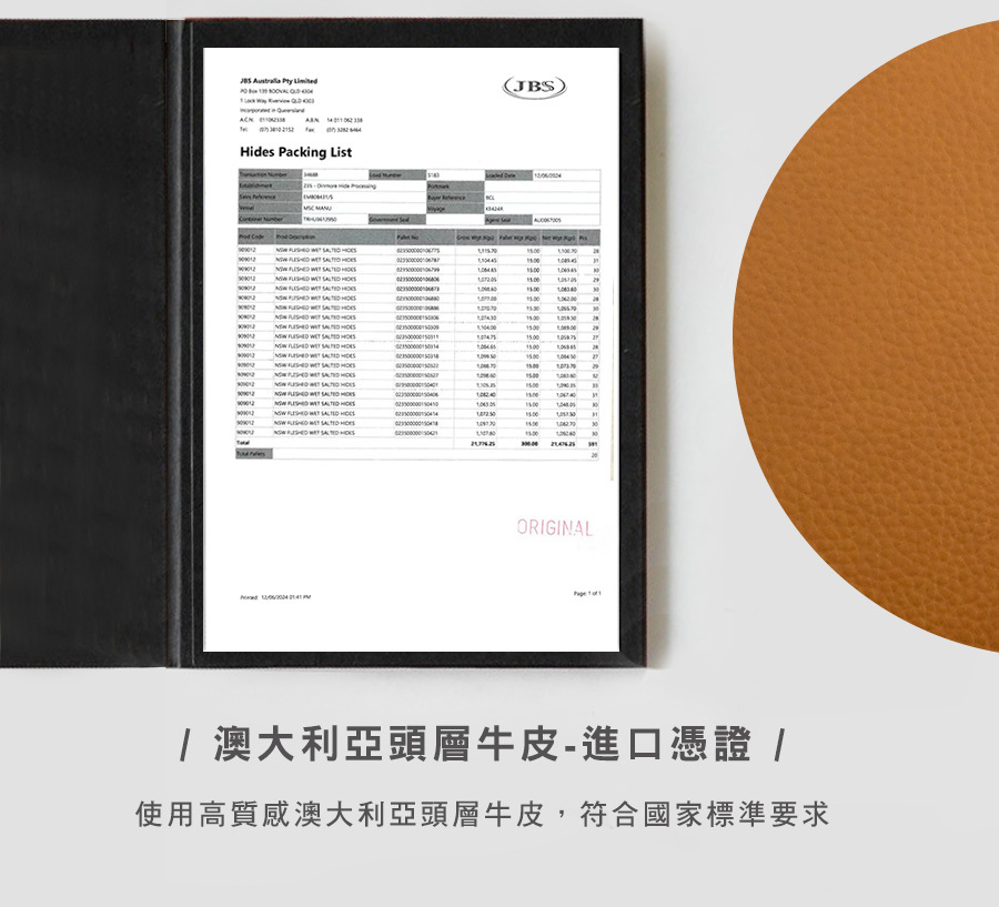 高規格澳大利亞頭層牛皮,具透氣性、耐磨性及抗拉強度