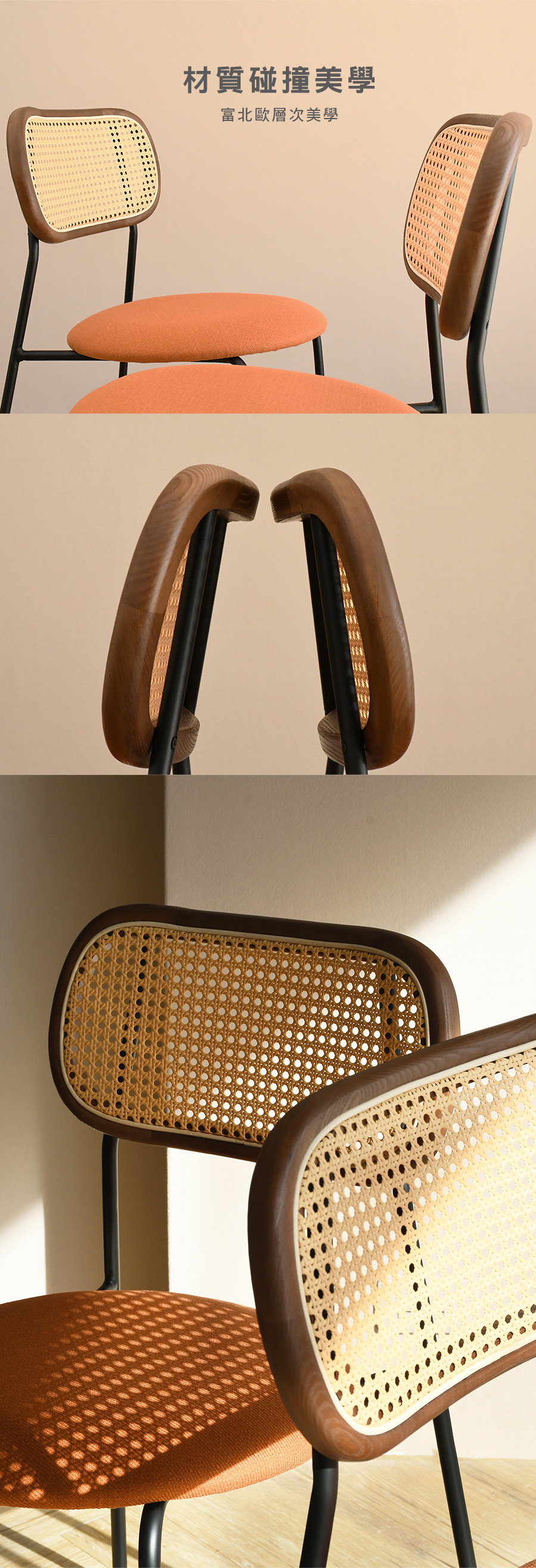 原物料:歐洲沙發專用布 / 烤漆鋼管 / 北美天然梣木(ASH) / 人造藤 / 高密度泡棉